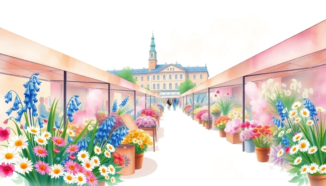 Watercolor illustration of a flower market in Stockholm, Sweden featuring linnaea, bluebells, daisies