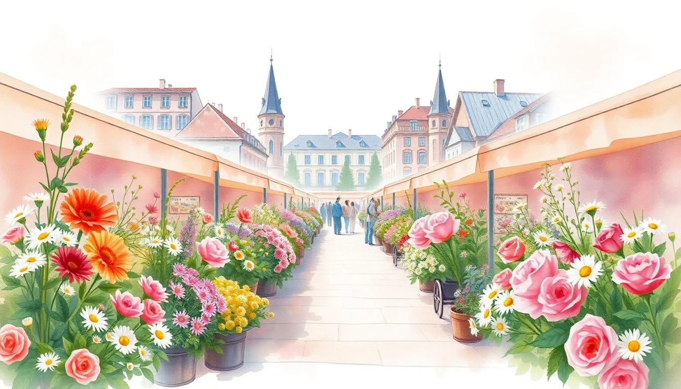 Watercolor illustration of a flower market in Cluj-Napoca, RO featuring wildflowers, daisies, roses