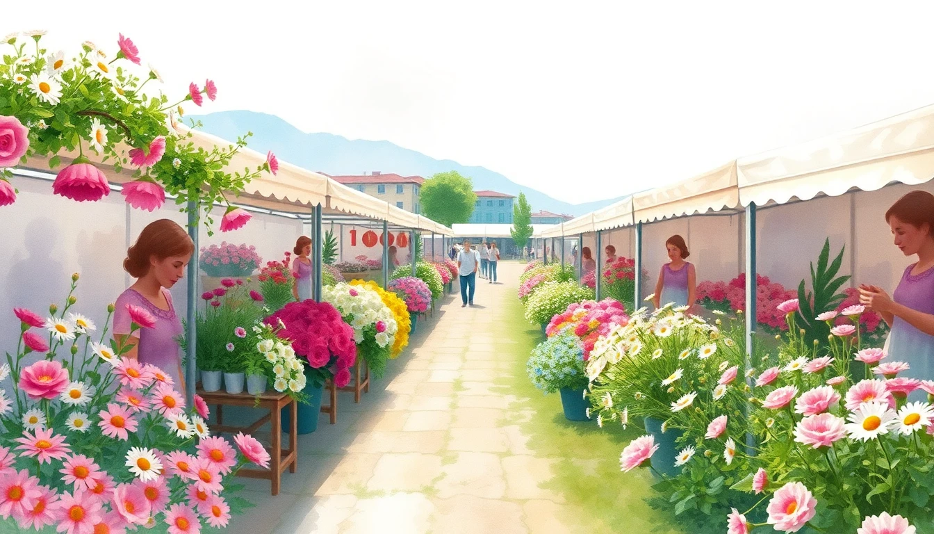 Watercolor illustration of a flower market in Sandanski, BG featuring wildflowers, daisies, roses