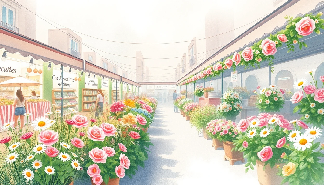 Watercolor illustration of a flower market in Lechería, VE featuring wildflowers, daisies, roses