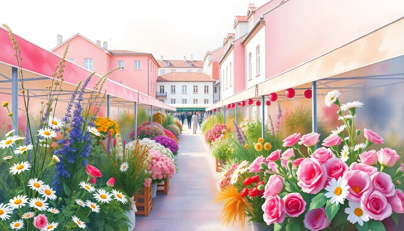 Watercolor illustration of a flower market in Bratislava, SK featuring wildflowers, daisies, roses