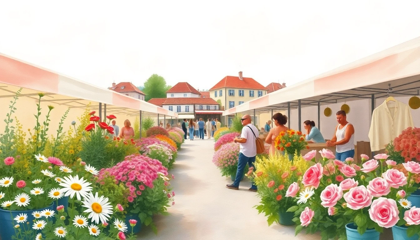 Watercolor illustration of a flower market in Nitra, SK featuring wildflowers, daisies, roses