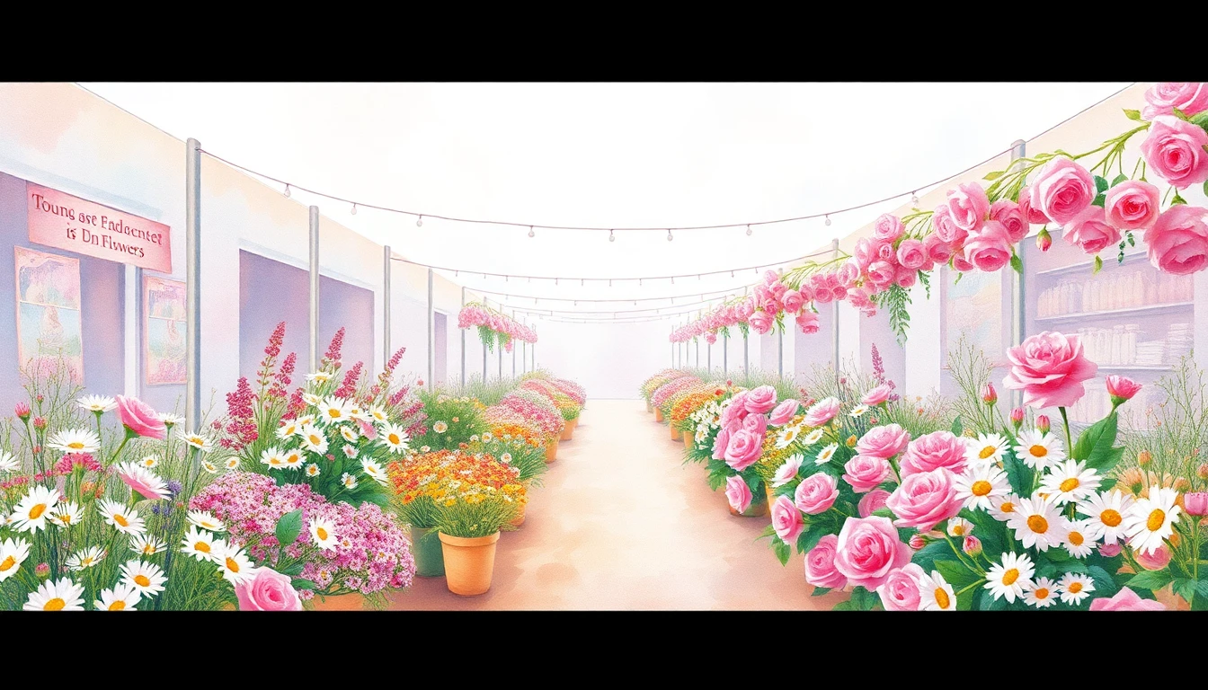 Watercolor illustration of a flower market in Sousse, TN featuring wildflowers, daisies, roses