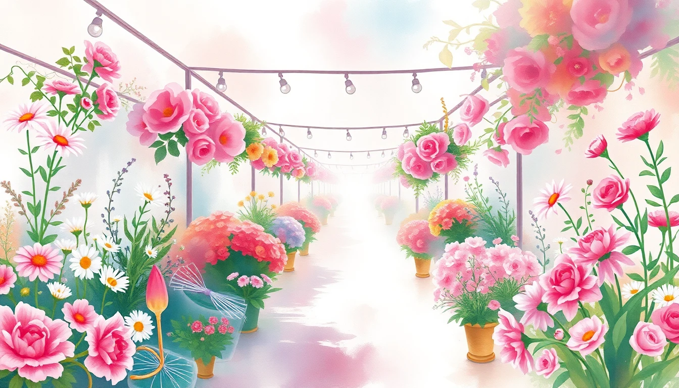 Watercolor illustration of a flower market in Caracas, VE featuring wildflowers, daisies, roses
